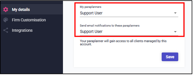 To set this up, navigate to General settings > My details and then select your Paraplanner/Administrator from the dropdown and then Save this change.