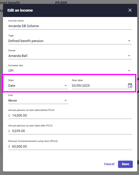 If your client is going to start taking income before retirement, update 'Start' to the date that the client will start taking income: