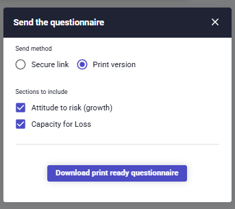 When going into the Client Profile section for a client, you'll see a 'Send questionnaire'. This button gives the option to create a secure link or a printable questionnaire to send to your client: