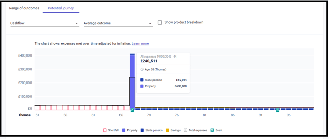 To make you aware, EVPro will show the amount of the property being sold on the expenses chart as an income (in this case the £400,000), but if you go to assets you would see that it has taken the money from the house sale less the debt amount and paid rest into cash.